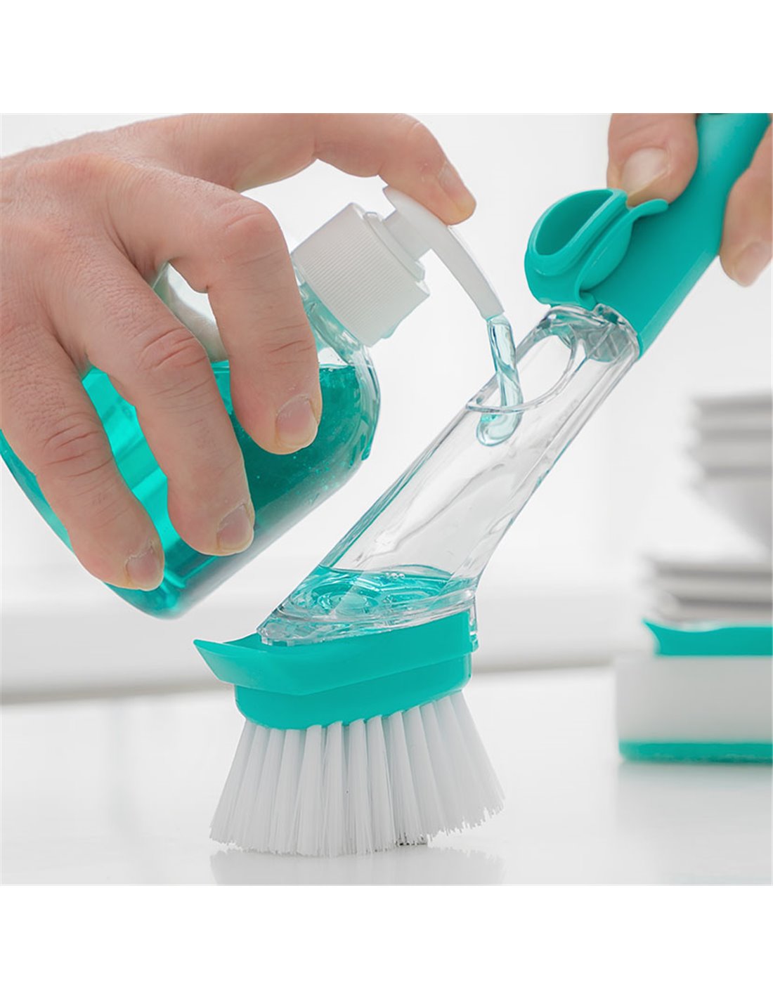 CEPILLO ESTROPAJO C/DISPENSADOR JABON Cepillo estropajo mango y dispensador de jabón INNOVAGOODS Cleasy ABS-nilón. Mango con depósito 50 ml para rellenar con jabón lavavajillas. Botón dispensador. Accesorios intercambiables: 1 cepillo para suciedad incrustada, 3 estropajos para suciedad normal. Dimensiones: 5x7xh.26 cm.