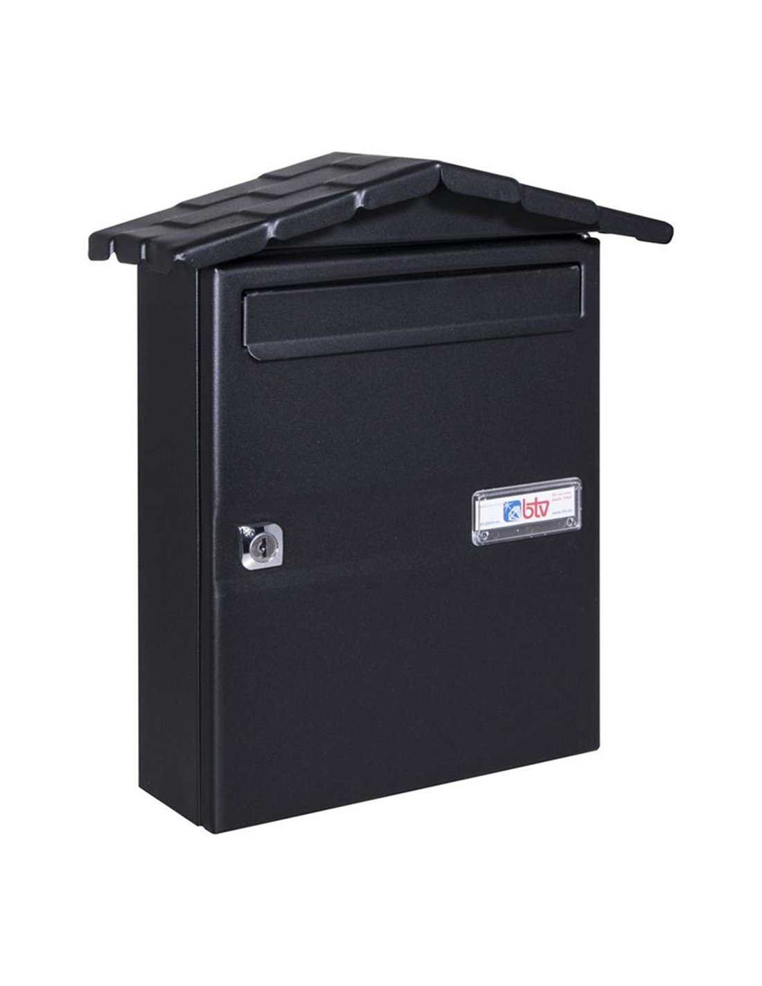 BUZON EXT. CHALET NE. 240X87X345 MM Buzón exterior BTV Mod. Chalet 24x8,7x34,5 cm. Fabricado en acero galvanizado y pintado. Apertura de puerta lateral. Soporte anticaída. Tarjetero de plástico. Negro.
