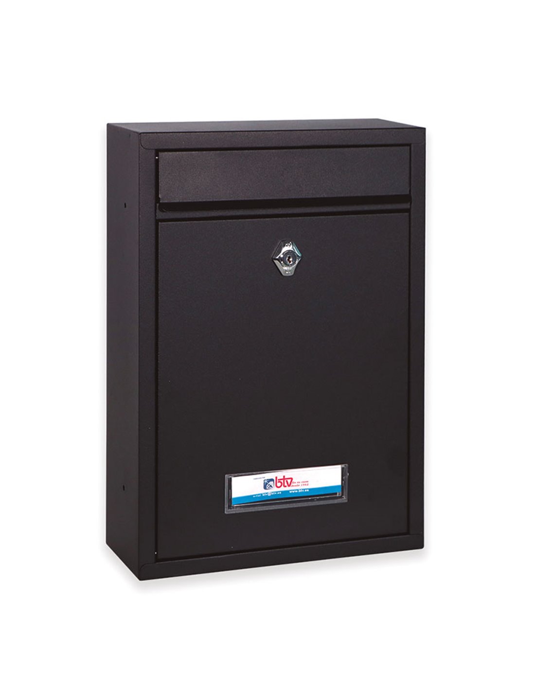 BUZON EXTERIOR MET. BERMEO. NEGRO. Buzón exterior individual BTV Bermeo Fabricado en acero pintado en poliéster. Disponible en distintos colores: blanco o negro. Apertura de puerta frontal hacia abajo. Preparado para anclaje. Cerradura de rombo. Dimensiones: 320x215x85 mm. Negro.