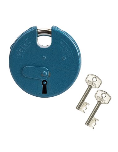 CANDADO REDONDO ACERO PINTADO 6 BORJAS Candado INCECA. Acero. Pintado azul martele. 2 llaves. 6 borjas. ø 90x20 mm.