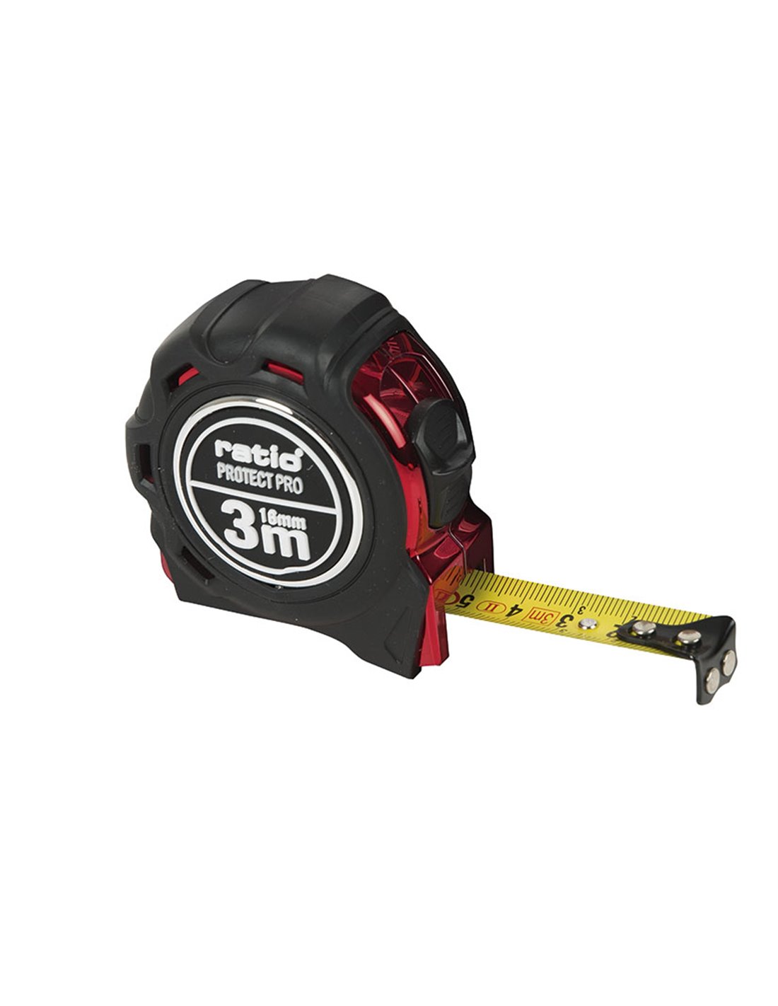 FLEXOMETRO CINTA 16/3MTS.RATIO MAGNETICO Flexómetro RATIO Protect Pro magnético ABS con recubrimiento antideslizante. Cinta numeración doble cara (amarilla/blanca) con revestimiento nilón antireflex. Gancho reforzado y magnético. Clip para cinturón y botón de bloqueo. Homologado CE. Clase de Precisión II. 3 m. Cinta 16 mm.