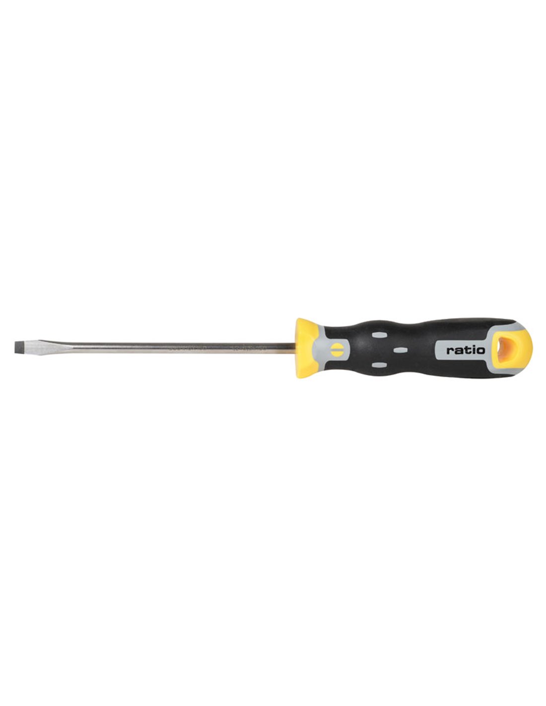 DESTORN.B.PLANA 4X100 RATIO PRO SERIES Destornillador RATIO ProSeries Mango trimaterial antideslizante. Varillas acero molibdeno-vanadio 60 HRc con tratamiento térmico integral. Puntas pavonadas con mecanizado de alta precisión. Fabricación nacional según norma DIN. Plana 0,8x4,0x100 mm.