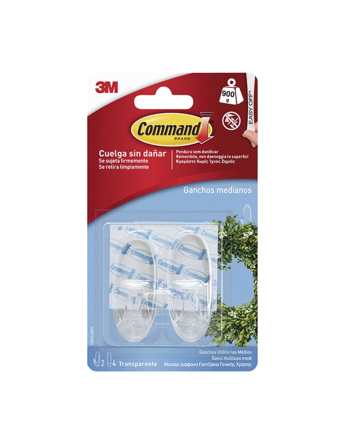 GANCHO MEDIANO.TRANSPAR.COMMAND(2UD.) Colgador adhesivo 3M serie Command. ############################################################################################################################################################################################################################################################### 2 ganchos medianos + 4 tiras. Soporta 1.4 kg. Transparente. No apto baño.\r\n7100127200