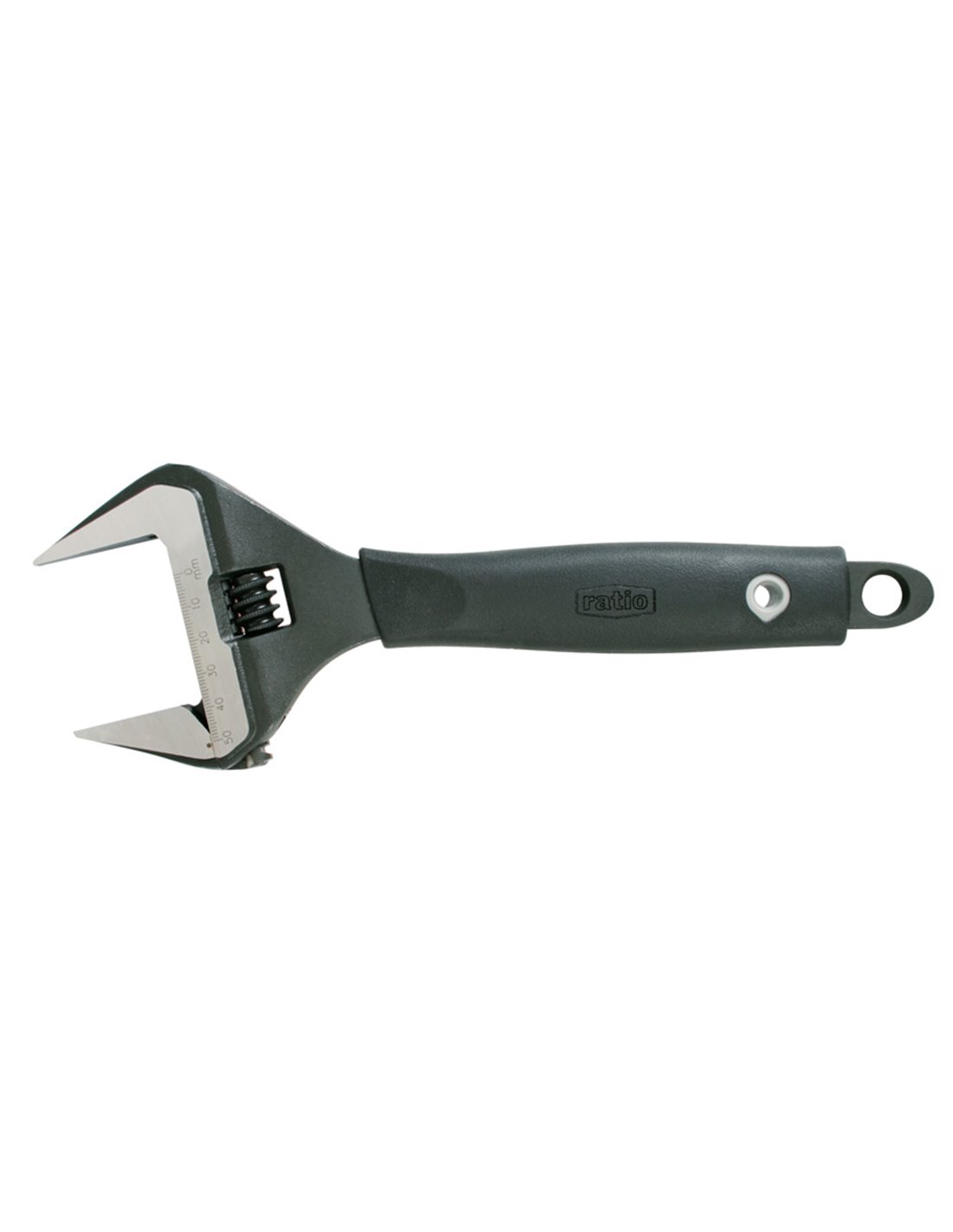 LLAVE GRADUABLE GRAN ABERTURA CHR-V 10" Llave graduable boca ancha RATIO 5995 Acero cromo-vanadio, acabado industrial fosfatado negro. Escala milimétrica. Llave más delgada que una llave standard. Mango ergonómico antideslizante. Toda la pieza con tratamiento térmico. Ajuste perfecto de la moleta con la cabeza. 10\"-250 mm. \r\nAbertura bocas: 0-50 mm. \r\nTuercas M1-M33.