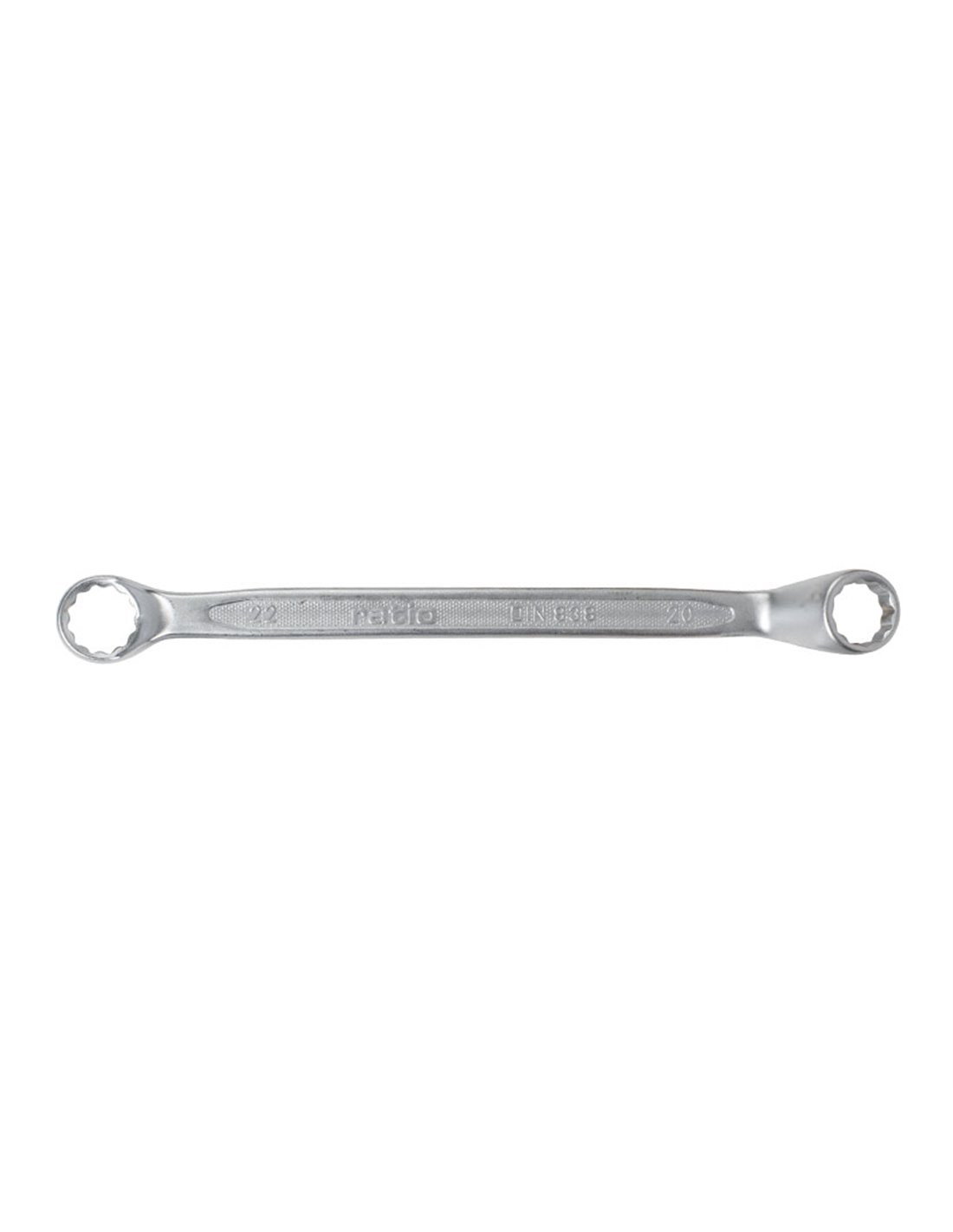 LLAVE FIJA ESTRELL.ACOD.CHR-V 20X22 Llave fija estrella acodada RATIO serie 6000. DIN 838. Acero cromo-vanadio satinado. Cuello de llave más ancho, aumenta la tensión de apriete. Cabezas con perfil alto. Panel central con grabado antideslizante. 20x22 mm.