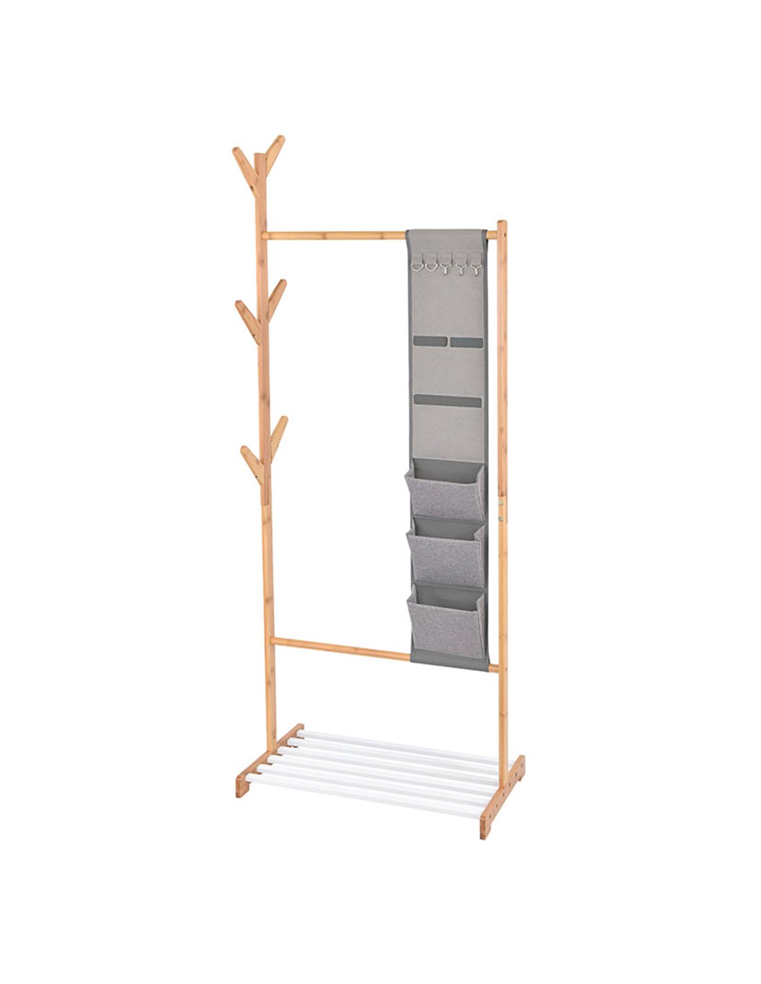COLGADOR BAMBU C/REPISA 65X38X167 CM. Perchero multiuso Bambú Madera de bambú con repisa para zapatos en plástico blanco. Modelo 1. 65x38xh.167 cm.\r\nIncluye organizador multiuso en poliéster gris.