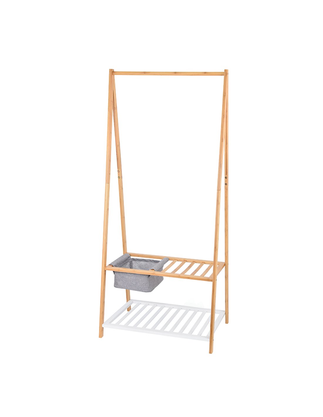 COLGADOR BAMBU C/REPISA 70X45X160 CM. Perchero multiuso Bambú Madera de bambú con repisa para zapatos en plástico blanco. Modelo 2. 70x45xh.160 cm.\r\nIncluye bandeja de madera con cesta en poliéster gris.