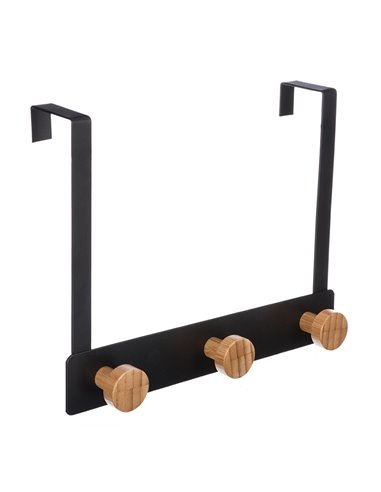 PERCHA P/PUERTA METAL/BAMBU 3 POM.NGRO. Perchero puerta Wood 3 pomos Metálico color negro o blanco. 3 colgadores en madera. Negro. 25x8,2xh.20 cm.