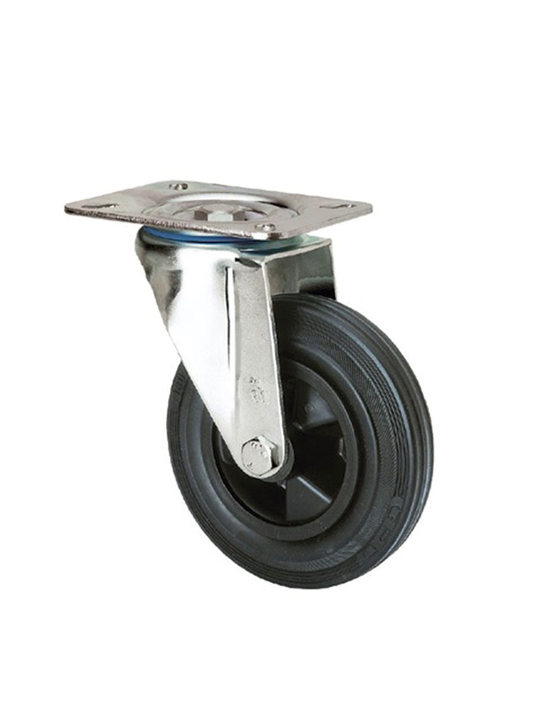 RUEDA GOMA NEGRA PLETINA ZV-PS 100 Rueda semi-industrial ALEX serie ZV-PS. Núcleo de poliamix y banda de goma. Soporte embutido con doble hilera de bolas. Acabado cincado brillante. Rueda suave y silenciosa. Máxima protección de los suelos. Absorción de golpes y vibraciones. Cojinete liso. Norma EN 12530/12532. ø 100 mm. Pletina giratoria sin freno. \r\nCarga máx. 100 kg.