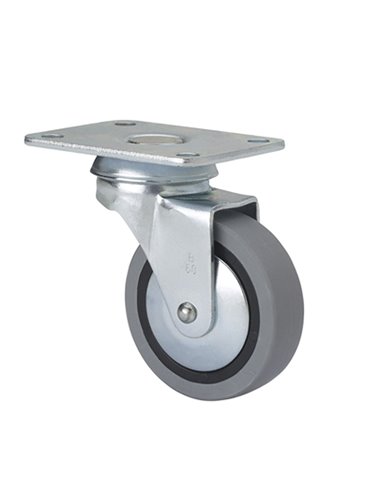 RUEDA GOMA GRIS GIRAT. C/PLETINA "B" 60 Rueda doméstica ALEX serie B. Rodamiento bolas. Núcleo de poliamix y banda de goma gris. Cojinete liso. Norma EN-12528. ø 60 mm. Pletina sin freno. 25 kg.