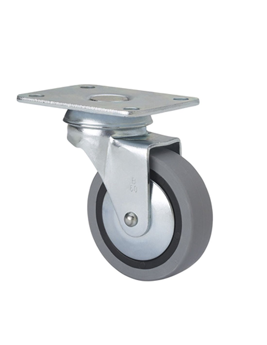 RUEDA GOMA GRIS GIRAT. C/PLETINA "B" 40 Rueda doméstica ALEX serie B. Rodamiento bolas. Núcleo de poliamix y banda de goma gris. Cojinete liso. Norma EN-12528. ø 40 mm. Pletina sin freno. 17 kg.